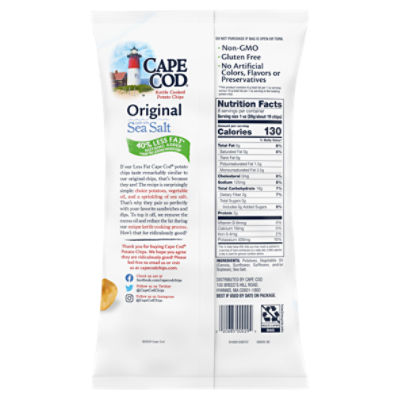 Cape Cod Potato Chips, Less Fat Original Kettle Cooked Chips, 8 Ounce CLASSIC ORIGINAL FLAVOR: Nothing but the pure taste of potato. LESS-FAT CHIPS: All the wonderful Cape Cod flavor but with less oil and 40% less fat than the leading brand of potato chips, with nothing added. KETTLE-COOKED POTATO CHIPS: Made one small batch at a time, with unique shapes for one-of-a-kind chips. QUALITY INGREDIENTS: No artificial ...