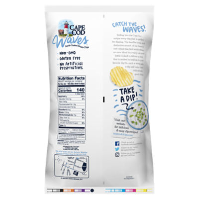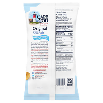 Cape Cod Potato Chips, Sea Salt and Vinegar Kettle Chips, 7.5 Oz ... KETTLE-COOKED POTATO CHIPS: Made one small batch at a time, with unique shapes and folds for one-of-a-kind-chips. GLUTEN FREE: A snack that's gluten-free. QUALITY INGREDIENTS: Kettle-cooked chips with no artificial colors, flavors, or preservatives. ROBUST FLAVOR: Enjoy a 7.5-ounce bag of remarkable taste and that wonderful Cape Cod crunch.